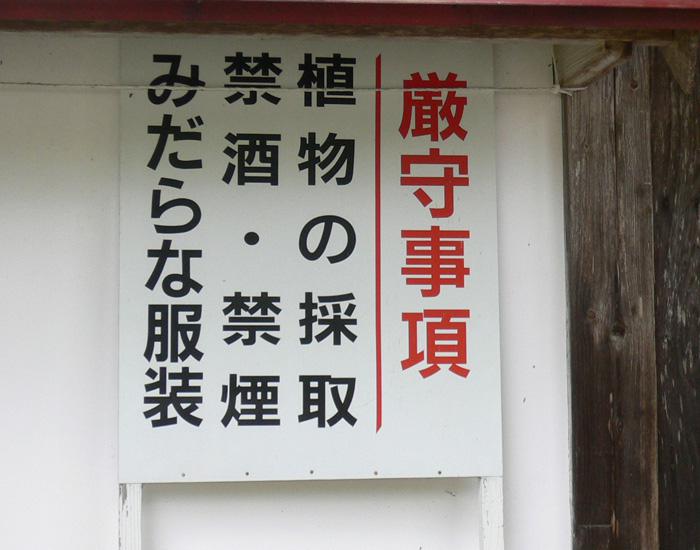お寺の注意書きに植物の採取、禁酒、禁煙、そして