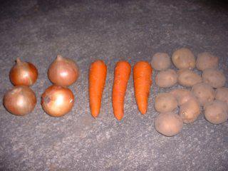お客さんにニンジン、たまねぎ、ジャガイモを貰う。