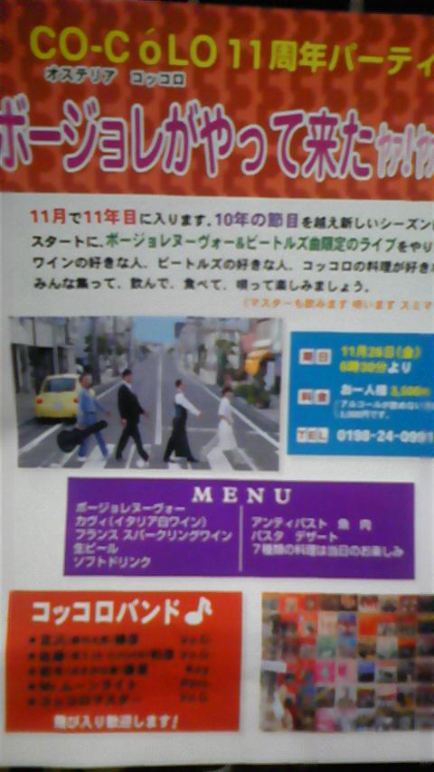 埼玉市にある(あった)ジョン・レノン・ミュージアムが惜しくも閉館。その一方で、先日、当販売店の購読者のみに折り込まれたチラシ、花巻市大通りにあるイタリア料理店「オステリア コッコロ」11周年記念パーティー『ボジョレーがやってきたヤァ!ヤァ!ヤァ!』。