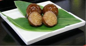 濃厚な旨味の「米沢牛のモモ肉」と川西町産「ひめのもち」を使用し、ふっくらと蒸したおこわを、牛モモでまあ〜るく包み、甘じょっぱく煮込んでからめ、一つずつ丁寧に手づくりで作られています。