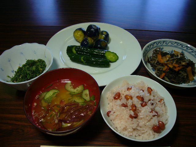 メニューは、紅大豆ごはん、薄皮丸なす・きゅうりの三五八漬、ひょう干し煮、人参の葉の切りあえ、冷やし汁、かぼちゃのごま和え。