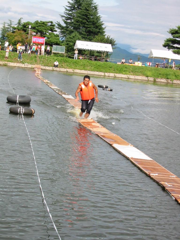 ダリヤ公園そばの鏡沼の上に浮かべた板を走り抜ける競技です。参加資格は中学生以上の男女で、参加申込が必要(先着40)!!!参加費は1,500円(当日持参)