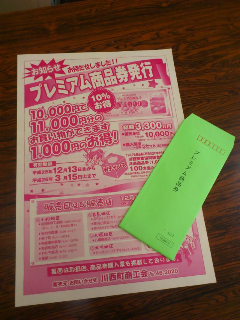 10%のプレミアムのついた、がんばる川西町プレミアム商品券を現在販売しております。使用期限は平成26年3月15日(土)までです。