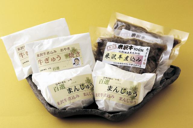100年続く秘伝のタレで煮込んだ米沢牛肩ロースと、それを具に使用した「まんじゅう」と「おやき」の箱詰めセット。(有)あっさりでしか味わえない商品をご家庭で堪能いただけます。また、セットではなくバラで購入することも可能です。