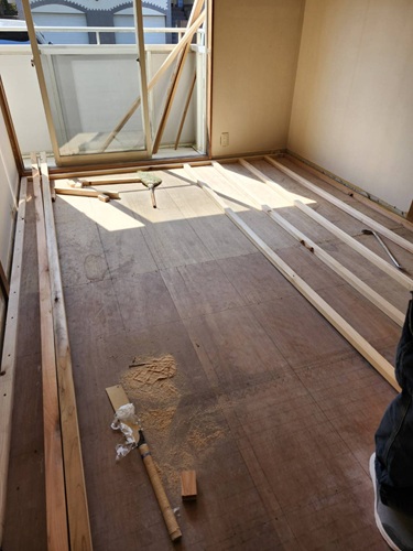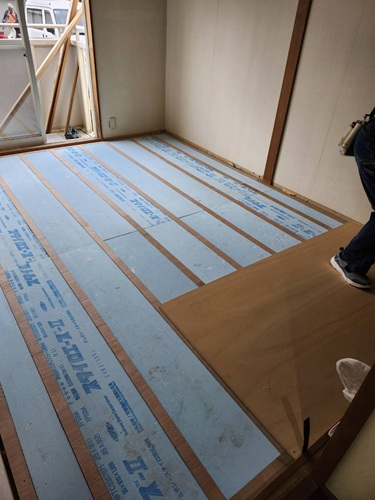 根太間にスタイロフォーム/コンパネを敷き、フロアー材の下地にします