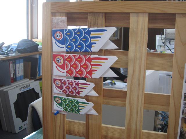 今日、事務所にも簡単手作りの鯉のぼりを飾りました。