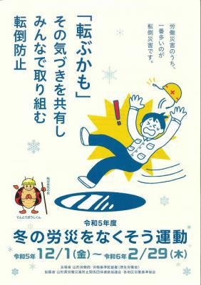 積雪・寒冷地である山形県は、12月から3月頃までの冬期間、低温や降雪、強い季節風などにより、凍結や積雪による転倒災害、堕落、転落災害、交通事故など冬期特有の労働災害が多発しています。
