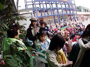 都会の果樹園200人以上の子供たちファミリー・・・会場には、感激して涙ぐむおじいさんやお母さんもいました。子供たちは初めて樹になったさくらんぼをみた子や、はじめてもぎ取りして食べた子供などいて美味しそうにほおばってます。