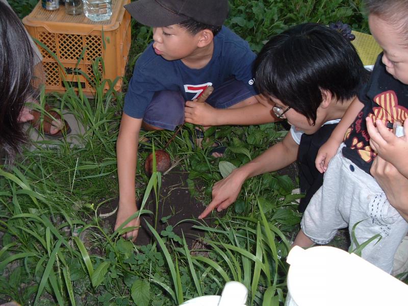 「みみずのお陰で、元気な葉っぱが育ち、美味しいぶどうになる。」それじゃ、みんなで土を掘って、みみずを探してみよう。