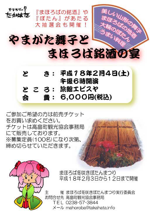 2006年2月3日から2月12日までの10日間開催されます『まほろば冬咲きぼたんまつり』のイベントとして、今回も『やまがた舞子とまほろば銘酒の宴』を開催いたします。"ぼたん"や"まほろばの地酒"があたる豪華抽選会も開催いたします。ご希望の方は、高畠町観光協会事務局にて前売りチケットをお買い求めください。