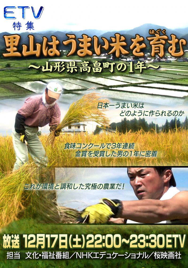 12月17日(土)22時〜23時半まで、NHK教育テレビのETV特集で、「里山はうまい米を育む 〜 山形県高畠町の1年」が放送されます。