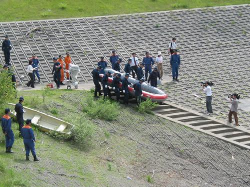 警察と消防関係者が、水難者に見立てたブイを回収したり、ロープを遠くに飛ばすエアガンの操作を確認していました。