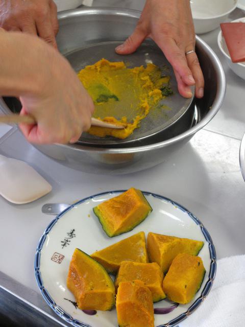 熱いうちに裏ごしをします。
