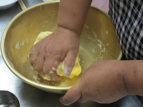 「米粉の手打ちパスタ野菜いっぱいスープ仕立て」と「米粉のカンノーリ風マスカルポーネクリーム詰め」のパスタ生地を作ります。パスタ生地は、二つのメニュー共通で使います。米粉に卵、オリーブオイルを入れて…耳タブ位の固さにこねて…米粉はグルテンがないのでとてもまとまりやすく、使いやすいのがいいですネ!