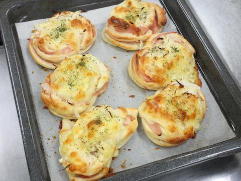 発酵が終わった生地の上に、玉葱、チーズ他を載せて