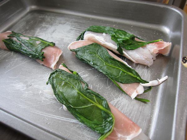 最後に白身魚のフリッターを作ります。白身魚に薄く塩コショウをして、生ハム、茹でたほうれん草を巻き、米粉をまぶします。白身魚に、生ハムとほうれん草を加えることで、彩りと味、食感の深みが増します。一手間のプロの技ですね。