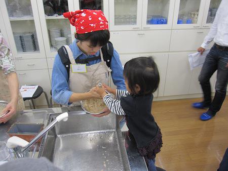 ママと一緒に生地をこねます。「美味しくなあれ…」