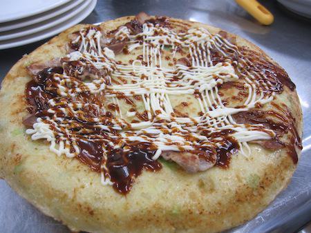 ソース、マヨネーズをトッピングしてお好み焼きが出来上がりです。