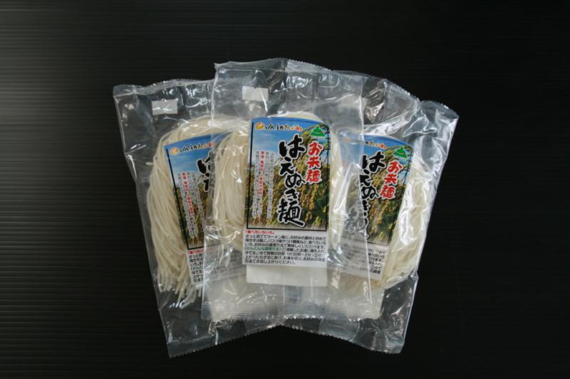 県産はえぬきの1等米の米粉(70%)と、北海道産馬鈴薯澱粉(30%)を使用し、はえぬきの特徴である強い粘りとしっかりした歯ごたえを表現しました。なめらかでもっちりした食感が魅力。麺は、無添加、食塩、小麦粉不使用で、アレルギー体質のかたにもおすすめ。米粉の配合が多いので腹持ちがよく、米本来の風味も楽しめます。