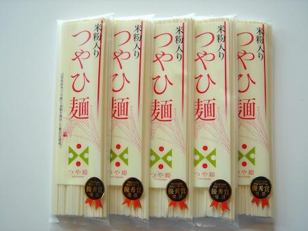県産米「つや姫」を使用。麺としての「おいしさ」にこだわり米粉の割合は30%にしました。小麦粉は当社で使用している麺にもっとも適した小麦を使用して、小麦粉だけの麺と違いツルッとした食感に仕上げました。乾麺専門の当社の技術を全面に活かしました。