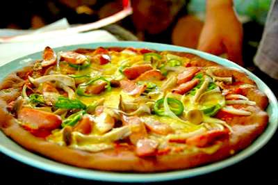(6)できた生地にピザソースを塗り、お好きな具材をトッピングし、チーズをのせて焼く。