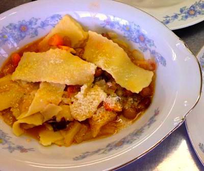 最後にキャベツを入れて煮込む。煮込んだ野菜スープに手打ちパスタを入れて完成。