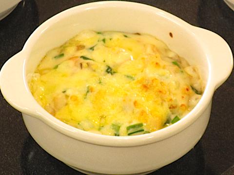 (9) (8)に(6)(1)(3)を入れ、味を調えてグラタン皿にあける。