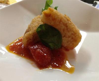 2. コロッケを皿に盛り、トマトソースをかけてルッコラを添える。