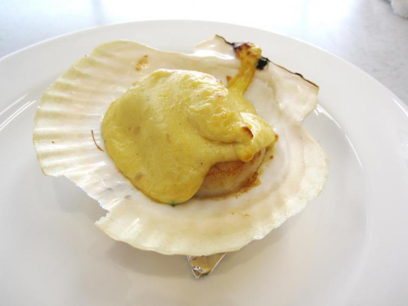 ホタテの上にソースをかけて 250°Cのオーブンで焼き色をつける。
