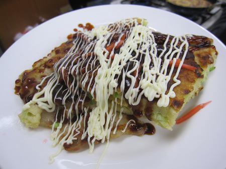 返しで裏返し、同じ様に焦げ目ができたら、ソース、青のり、鰹節を