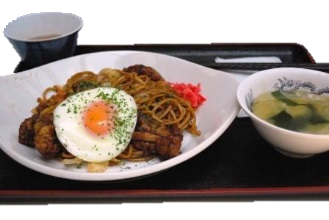 粉は県産米使用。 焼きそばと山形名物のゲソ天を合わせ非常にインパクトのあるメニューです。