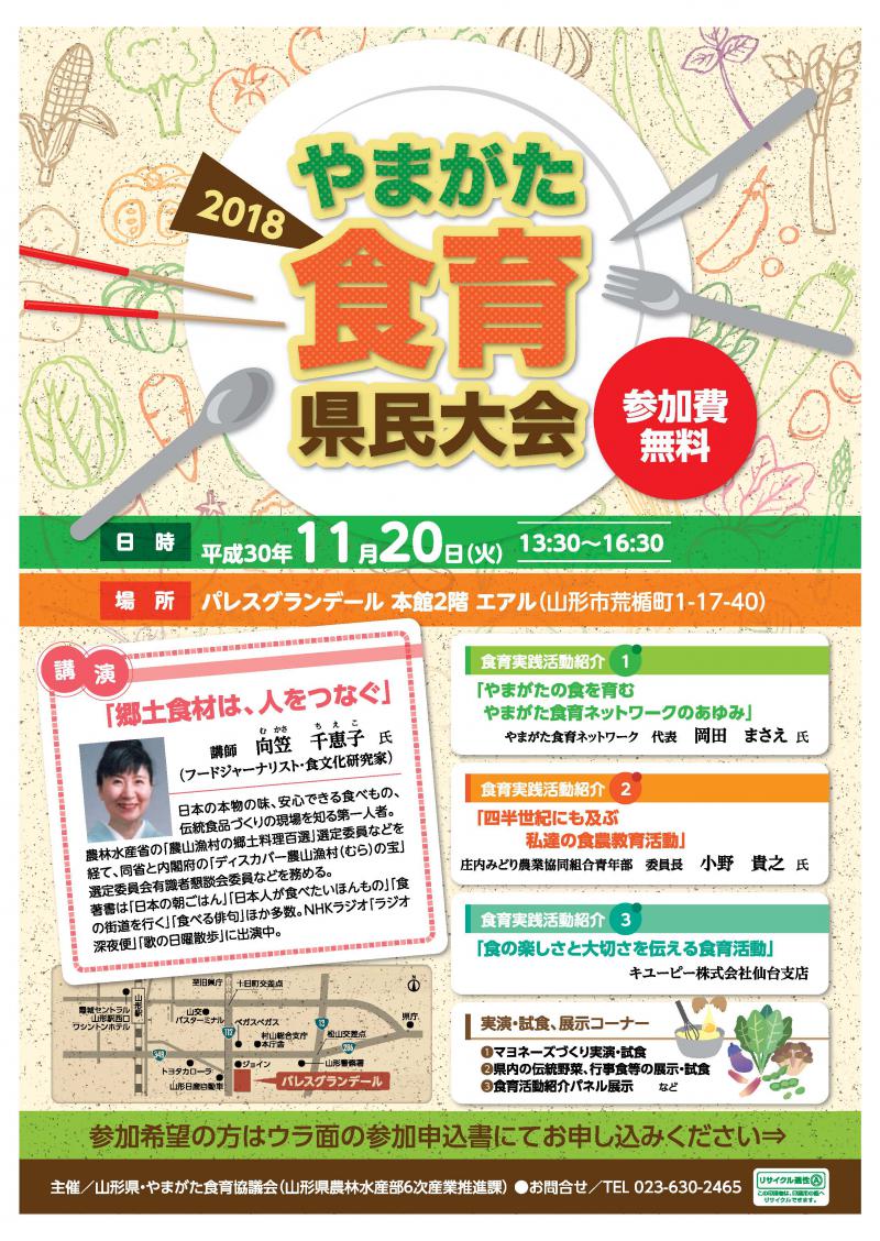 本県の豊かな農林水産物や食文化の継承・発展に向け、本県の食と農の魅力や価値を広く発信し、子どもから高齢者まで生涯にわたって健全な食生活が実践されるよう、食育活動の重要性についての理解を深め、広く県民に普及・定着させるため、下記のとおり「やまがた食育県民大会」を開催します。大会当日は、米粉に関するPR展示も行います。是非、御参加下さい。