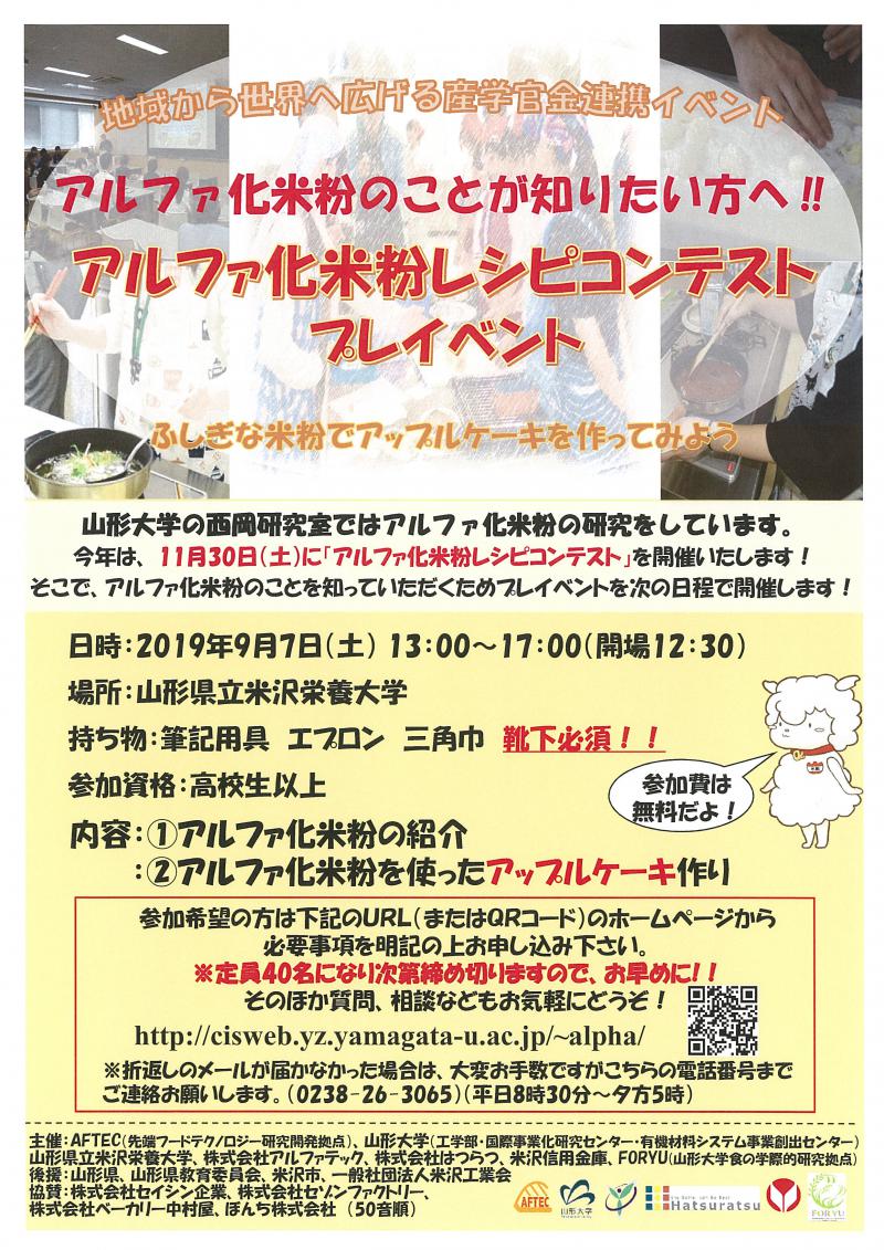 山形大学の西岡研究室ではアルファ化米粉の研究をしており、アルファ化米粉の普及拡大のため、11月30日(土)に「アルファ化米粉レシピコンテスト」を開催します。