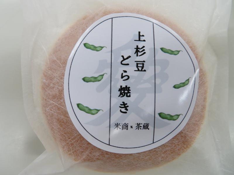 置賜地域で生産される枝豆「上杉豆」を練り込んだクリームを、県産米「はえぬき」米粉を使用した生地ではさんだどら焼きです。パッケージには、米沢の武将、直江兼続の兜飾りである「愛」を取り入れました。
