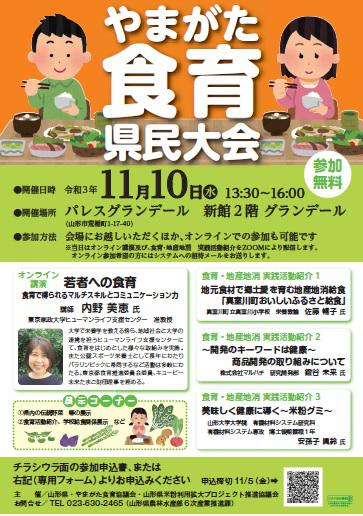 山形県では、本県の食と農の魅力や価値を広く発信するとともに、食育・地産地消の重要性について県民の理解増進を図るため、下記のとおり「やまがた食育県民大会」を開催します。