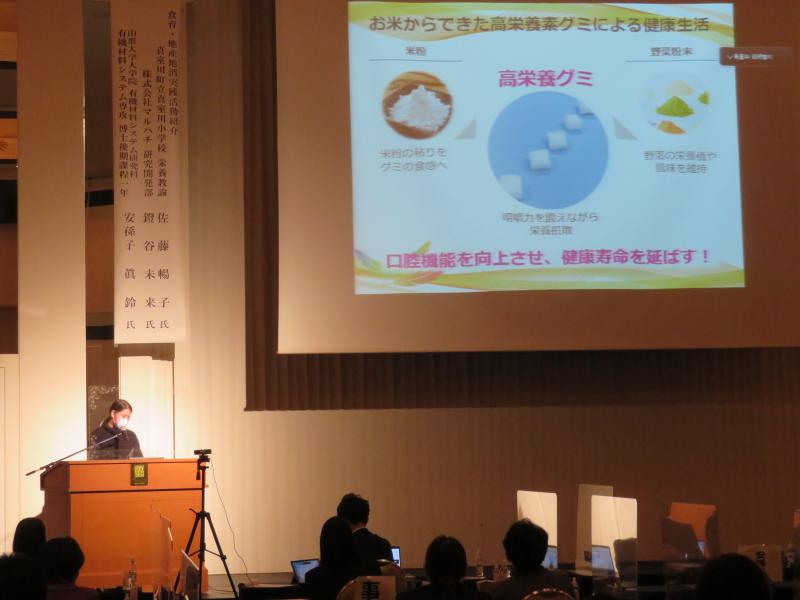 令和3年11月10日(水)、山形市内のパレスグランデールにおいて令和3年度やまがた食育県民大会を開催し、今年度は「米粉利用拡大セミナー」として、山形大学大学院有機材料システム研究科博士後期課程1年の安孫子真鈴さんが「美味しく健康に導く〜米粉グミ〜」と題して、米粉の食育・地産地消実践活動の発表を行いました。
