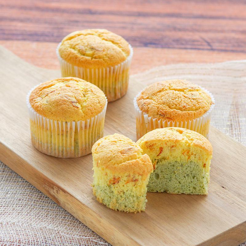 山形県立置賜農業高校とのコラボ商品、山形県産の米粉を使用して、ふわふわ感とボリューム感のある生地を作り、紅花「乱花」と「若菜」を生地に練り込み抗酸化力が高くアンチエイジング効果や彩を持たせ、県産ラフランスをトッピングし紅花をイメージできる形に焼き上げました。
