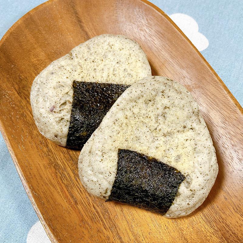 見た目はおむすび。食べるともちもちな米粉ぱん!!生地にゆかりを練り込み、中にしそこんぶの佃煮を包みました。
