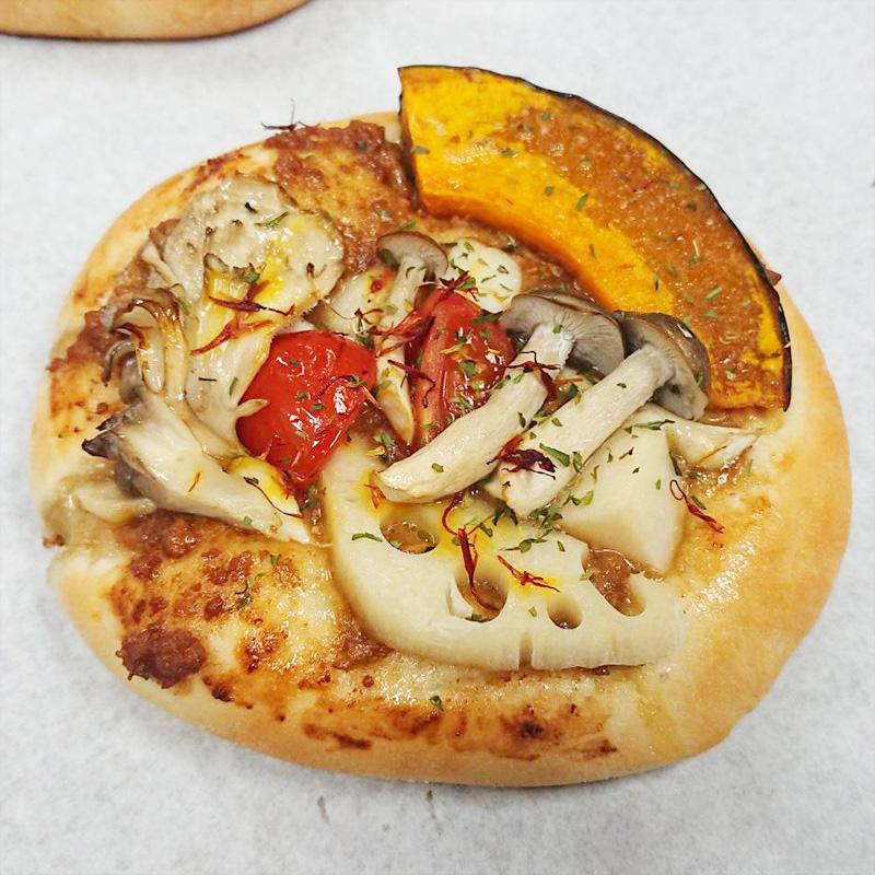 県産はえぬき米粉を対粉50%生地に配合し、味噌だれをベースとして野菜やきのこ、紅花をトッピングした彩りの良いフォカッチャ