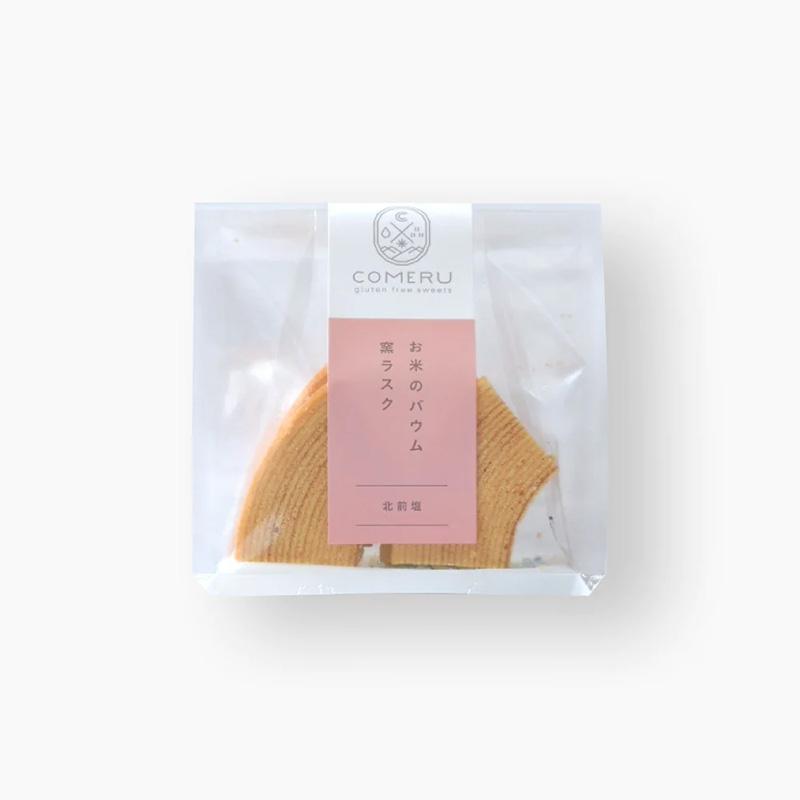 はえぬき米粉100%の生地に庄内浜の塩を加えた「北前塩ばうむ」を薄くスライスしてさらに平釜でじっくり焼き上げたラスクです。山形県酒田市産のはえぬき米粉の甘みと、庄内浜の海水から作った北前塩のゆたかな味わいをご堪能ください。
