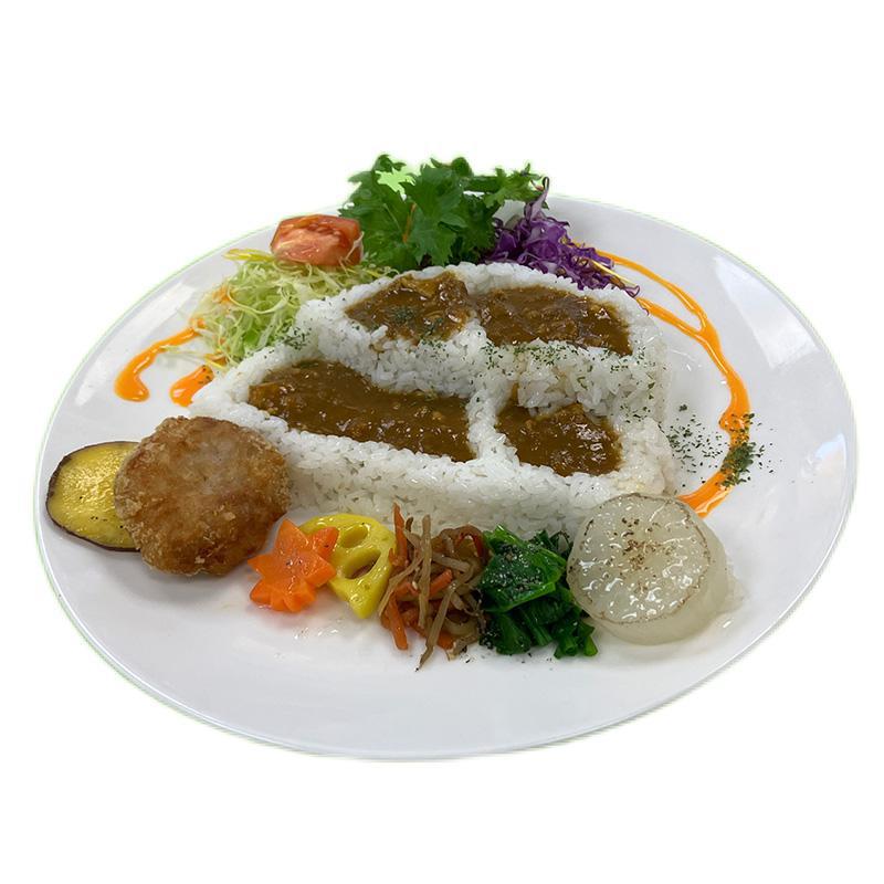 県産の米澤一番育ちのメンチカツ、西蔵王高原の法蓮草、大根、キャベツ、県産の棚田米などプレミアムなやまがたの米粉カレーに仕上げてあります。