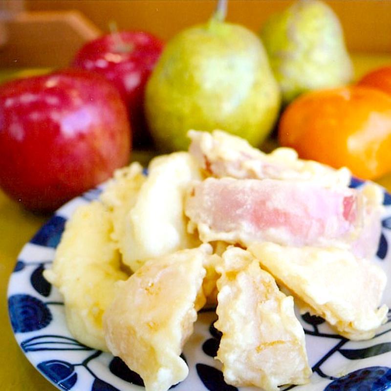 県産の果物と米粉を天ぷらにしました。