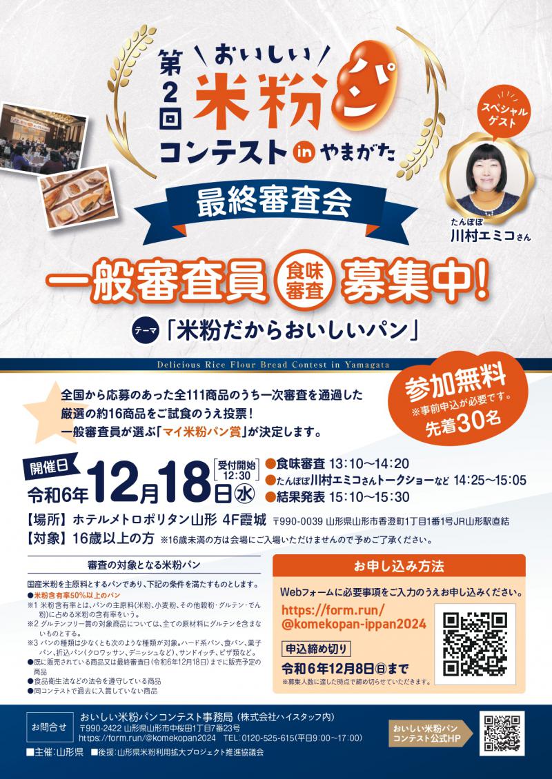 令和6年12月18日(水)にホテルメトロポリタン山形で開催する「第2回おいしい米粉パンコンテスト」inやまがた 最終審査会で「マイ米粉パン賞」に投票してくださる一般審査員を募集しています。全国から応募があった111品の内、最終審査会に進出した16品を試食し投票いただきます。全国の米粉パンが集まるまたと無い機会ですので振って申し込みください。