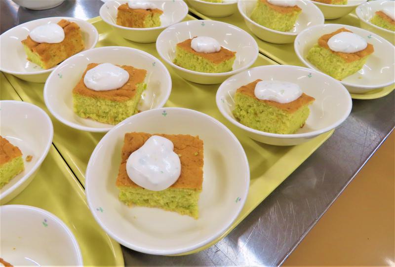 5.シフォンケーキ型に空気が入らないように流しいれ、スチコンで30〜35分焼く(ホテルパンの場合も同様)。焼きあがったら型を逆さにして冷ます(ホテルパンの場合は逆さにせずに網の上にのせて冷ます)。