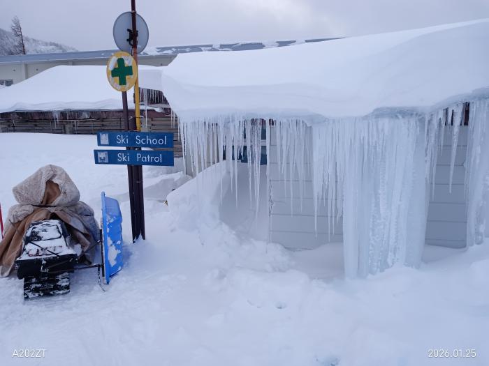 天元台高原のスキーパトロールのモービル小屋は毎年大きなつららができくる・・建物の内部は暖房が入っていますから、屋根から熱が伝わり、積もった雪を屋根側からゆっくり融かします。 融け水は、屋根の傾きのために軒先に向かって流れていき、軒先で外気にさらされると再び冷やされて凍り始める、 こうして、氷のかたまりが軒先にぶら下がりますね・・特に寒暖差が厳しい天元台ならではの大きさです。
