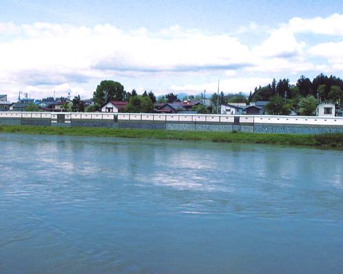 歴史ある町並みを洪水から守るため、昭和40年から最上川の両岸に特殊堤防を整備。さらに町並みとの調和を図るため、平成3年〜7年にかけて、壁面に当時をしのぶ当時の様子を描いた。水面近くまで階段で下りて、対岸の景色が楽しめるようにもなっている。