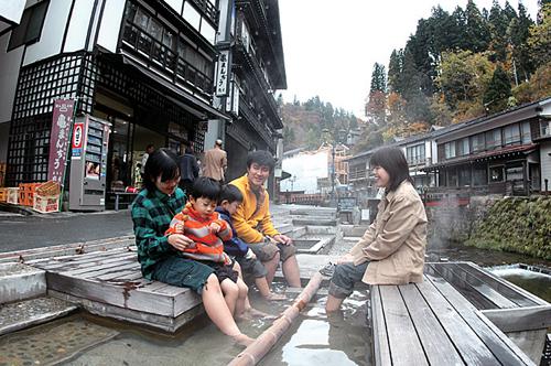 銀山温泉入り口の白銀橋を渡ってすぐの場所にある。足湯の底に敷き詰められた玉砂利がツボを刺激して心地よい。