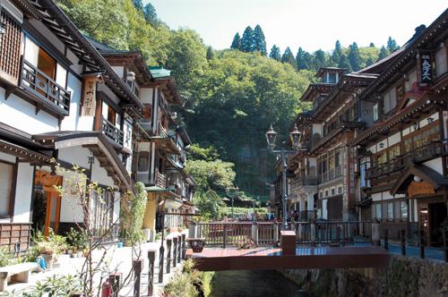 支川・丹生川のさらに上流、銀山川を挟んで湯宿が立ち並ぶ銀山温泉。古来、出羽の名湯として名高く、大正時代に立てられた和洋折衷のモダンな木像の宿が印象的。日が沈むとガス灯に照らされる様子にも風情がある。周辺には白銀の滝、長蛇渓などの美しい自然が残る。