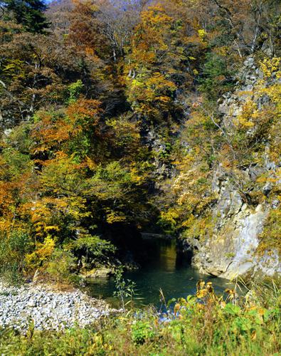 新庄の侍・小山八郎が、通行人を困らせていた大蛇を退治したという伝説が残る小松渕。銅山川の上流、肘折温泉の手前に位置する渓谷で、巨岩に沿って大きく蛇行する。新緑や紅葉が水面に映えて、四季折々の彩りが美しい渓谷。温泉街からも近く散策路が整備されている。