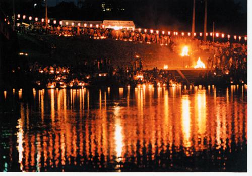 鮭川を目の前に建つ、庭月観音。昔から満願の霊場として信仰が厚く、最上三十三観音打ち止めの寺として、多くの巡礼者が集まる。毎年8月18日には、鮭川で灯篭流しが行われ水面が橙色のやさしい光に包まれる。仏式では東日本一ともいわれる規模だ。